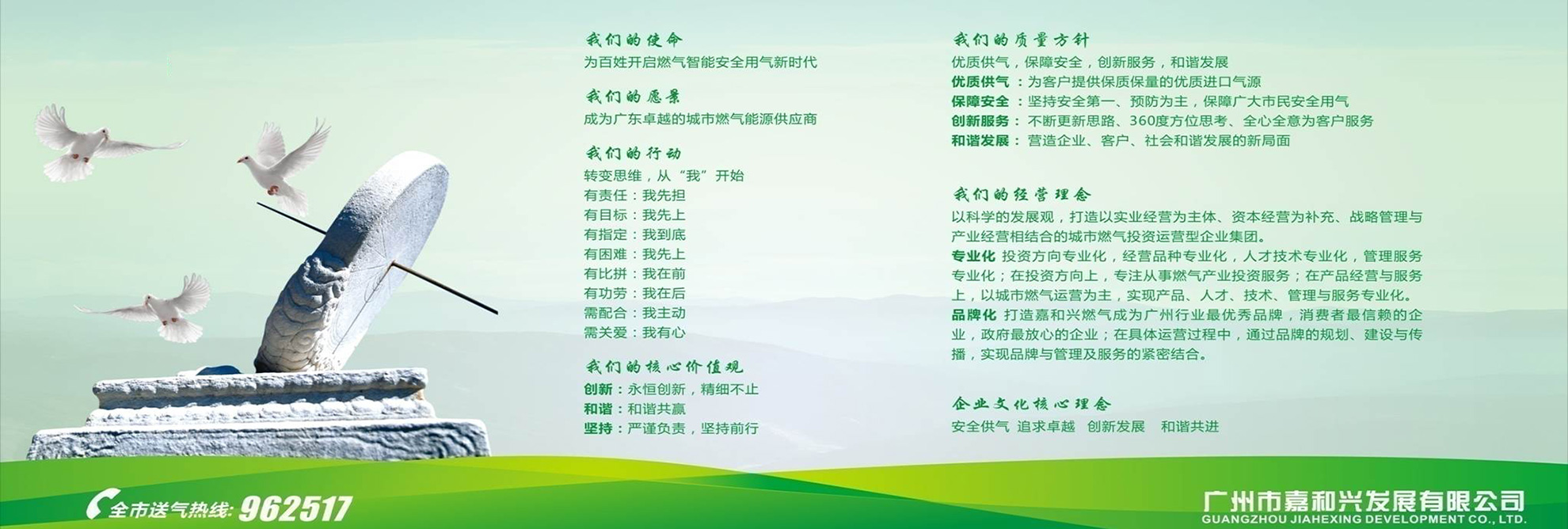 ——廣州市嘉和興發展有限公司于2001年3月1日注冊成立,主要從事瓶裝液化石油氣(LPG)批發貿易,民用、工業用液化石油氣,工業用氣體,汽車加氣站及危險品物流運輸等,總部設在廣州。目前公司經營三個液化氣充裝站、一個汽車加氣站:白云區神山達嶺液化石油氣站、白云區加禾氣站和佛山市南海區冠順氣站,黃埔區塘口汽車加氣站,總庫容接近800立方米。
